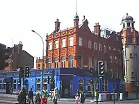 Le bâtiment d'origine du Bush Theatre au-dessus du pub The Bush, au coin de Goldhawk Road et Shepherd's Bush Green (2005). Le Shepherd's Bush Empire est à droite.