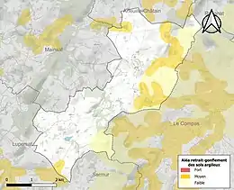 Le retrait-gonflement des sols argileux est susceptible d'engendrer des dommages importants aux bâtiments en cas d’alternance de périodes de sécheresse et de pluie. 14,9 % de la superficie communale est en aléa moyen ou fort (33,6 % au niveau départemental et 48,5 % au niveau national). Sur les 74 bâtiments dénombrés sur la commune en 2019, 1 sont en aléa moyen ou fort, soit 1 %, à comparer aux 25 % au niveau départemental et 54 % au niveau national. Une cartographie de l'exposition du territoire national au retrait gonflement des sols argileux est disponible sur le site du BRGM[18],[Carte 2].