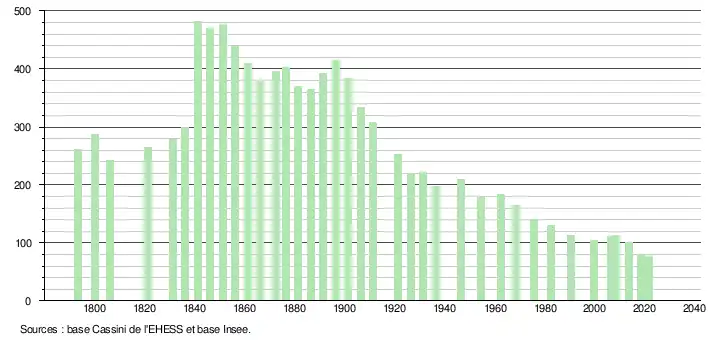 L'évolution du nombre d'habitants est connue à travers les recensements de la population effectués dans la commune depuis 1793. Pour les communes de moins de 10 000 habitants, une enquête de recensement portant sur toute la population est réalisée tous les cinq ans, les populations légales des années intermédiaires étant quant à elles estimées par interpolation ou extrapolation[21]. Pour la commune, le premier recensement exhaustif entrant dans le cadre du nouveau dispositif a été réalisé en 2008[22].