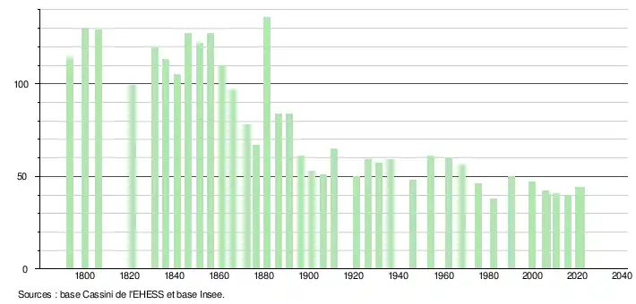 L'évolution du nombre d'habitants est connue à travers les recensements de la population effectués dans la commune depuis 1793. Pour les communes de moins de 10 000 habitants, une enquête de recensement portant sur toute la population est réalisée tous les cinq ans, les populations légales des années intermédiaires étant quant à elles estimées par interpolation ou extrapolation[13]. Pour la commune, le premier recensement exhaustif entrant dans le cadre du nouveau dispositif a été réalisé en 2005[14].
