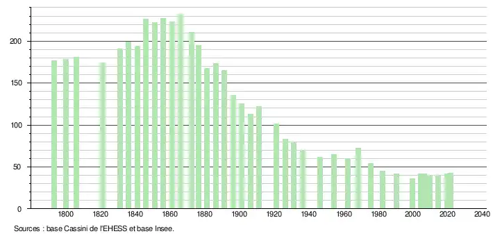 L'évolution du nombre d'habitants est connue à travers les recensements de la population effectués dans la commune depuis 1793. Pour les communes de moins de 10 000 habitants, une enquête de recensement portant sur toute la population est réalisée tous les cinq ans, les populations légales des années intermédiaires étant quant à elles estimées par interpolation ou extrapolation[14]. Pour la commune, le premier recensement exhaustif entrant dans le cadre du nouveau dispositif a été réalisé en 2004[15].