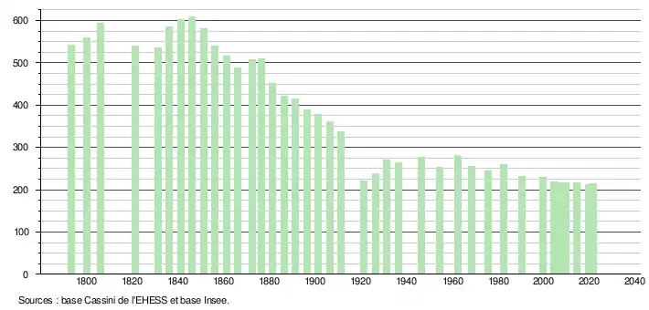 L'évolution du nombre d'habitants est connue à travers les recensements de la population effectués dans la commune depuis 1793. Pour les communes de moins de 10 000 habitants, une enquête de recensement portant sur toute la population est réalisée tous les cinq ans, les populations légales des années intermédiaires étant quant à elles estimées par interpolation ou extrapolation[15]. Pour la commune, le premier recensement exhaustif entrant dans le cadre du nouveau dispositif a été réalisé en 2004[16].