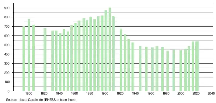 L'évolution du nombre d'habitants est connue à travers les recensements de la population effectués dans la commune depuis 1793. Pour les communes de moins de 10 000 habitants, une enquête de recensement portant sur toute la population est réalisée tous les cinq ans, les populations légales des années intermédiaires étant quant à elles estimées par interpolation ou extrapolation[17]. Pour la commune, le premier recensement exhaustif entrant dans le cadre du nouveau dispositif a été réalisé en 2005[18].