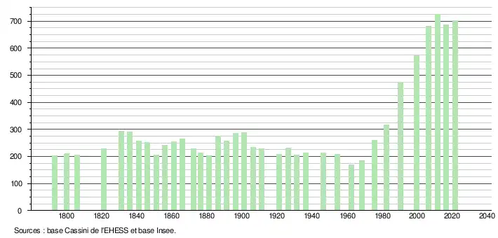 - Population municipale légale en vigueur au 1er janvier 2024, millésimée 2021, définie dans les limites territoriales en vigueur au 1er janvier 2023, date de référence statistique : 1er janvier 2021.