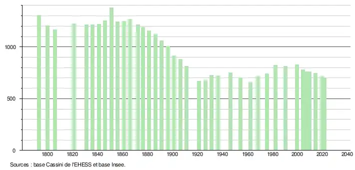 L'évolution du nombre d'habitants est connue à travers les recensements de la population effectués dans la commune depuis 1793. Pour les communes de moins de 10 000 habitants, une enquête de recensement portant sur toute la population est réalisée tous les cinq ans, les populations légales des années intermédiaires étant quant à elles estimées par interpolation ou extrapolation[15]. Pour la commune, le premier recensement exhaustif entrant dans le cadre du nouveau dispositif a été réalisé en 2004[16].