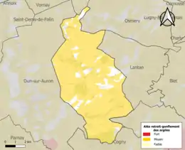 La commune est vulnérable au risque de mouvements de terrains constitué principalement du retrait-gonflement des sols argileux[15]. Cet aléa est susceptible d'engendrer des dommages importants aux bâtiments en cas d’alternance de périodes de sécheresse et de pluie. 90,1 % de la superficie communale est en aléa moyen ou fort (90 % au niveau départemental et 48,5 % au niveau national). Sur les 207 bâtiments dénombrés sur la commune en 2019, 181 sont en aléa moyen ou fort, soit 87 %, à comparer aux 83 % au niveau départemental et 54 % au niveau national. Une cartographie de l'exposition du territoire national au retrait gonflement des sols argileux est disponible sur le site du BRGM[16],[Carte 2].