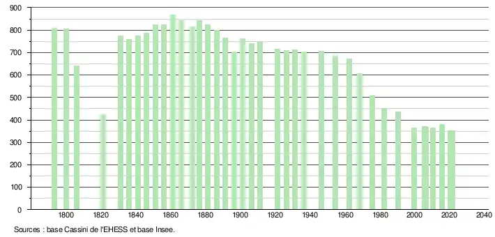 L'évolution du nombre d'habitants est connue à travers les recensements de la population effectués dans la commune depuis 1793. Pour les communes de moins de 10 000 habitants, une enquête de recensement portant sur toute la population est réalisée tous les cinq ans, les populations légales des années intermédiaires étant quant à elles estimées par interpolation ou extrapolation[20]. Pour la commune, le premier recensement exhaustif entrant dans le cadre du nouveau dispositif a été réalisé en 2005[21].
