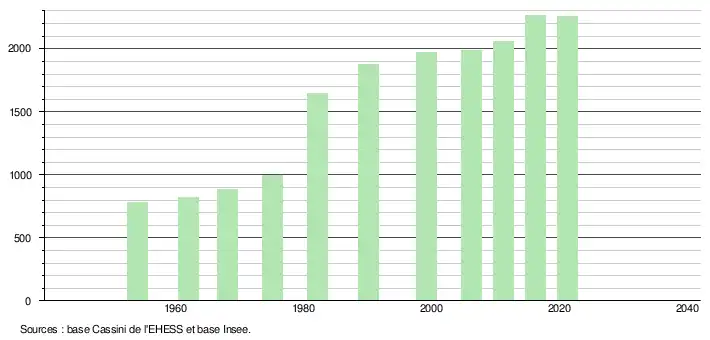 L'évolution du nombre d'habitants est connue à travers les recensements de la population effectués dans la commune depuis 1954. Pour les communes de moins de 10 000 habitants, une enquête de recensement portant sur toute la population est réalisée tous les cinq ans, les populations légales des années intermédiaires étant quant à elles estimées par interpolation ou extrapolation[30]. Pour la commune, le premier recensement exhaustif entrant dans le cadre du nouveau dispositif a été réalisé en 2006[31].