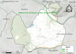 Le réseau Natura 2000 est un réseau écologique européen de sites naturels d'intérêt écologique élaboré à partir des directives habitats et oiseaux, constitué de zones spéciales de conservation (ZSC) et de zones de protection spéciale (ZPS)[Note 2]. Un site Natura 2000 a été défini sur la commune au titre de la directive habitats : Les « vallées du Tarn, de l'Aveyron, du Viaur, de l'Agout et du Gijou »[17], d'une superficie de 17 144 ha, s'étendent sur 136 communes dont 41 dans l'Aveyron, 8 en Haute-Garonne, 50 dans le Tarn et 37 dans le Tarn-et-Garonne. Elles présentent une très grande diversité d'habitats et d'espèces dans ce vaste réseau de cours d'eau et de gorges. La présence de la Loutre d'Europe et de la moule perlière d'eau douce est également d'un intérêt majeur[18].