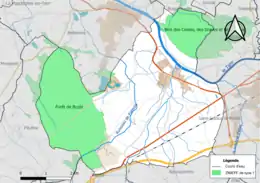 L'occupation des sols de la commune, telle qu'elle ressort de la base de données européenne d’occupation biophysique des sols Corine Land Cover (CLC), est marquée par l'importance des territoires agricoles (59,1 % en 2018), néanmoins en diminution par rapport à 1990 (62 %). La répartition détaillée en 2018 est la suivante : terres arables (46,3 %), forêts (31,3 %), zones agricoles hétérogènes (12 %), zones urbanisées (3,4 %), espaces verts artificialisés, non agricoles (2,8 %), eaux continentales[Note 7] (2,2 %), milieux à végétation arbustive et/ou herbacée (1,2 %), prairies (0,8 %)[25]. L'évolution de l’occupation des sols de la commune et de ses infrastructures peut être observée sur les différentes représentations cartographiques du territoire : la carte de Cassini (XVIIIe siècle), la carte d'état-major (1820-1866) et les cartes ou photos aériennes de l'IGN pour la période actuelle (1950 à aujourd'hui)[Carte 2].