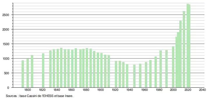 L'évolution du nombre d'habitants est connue à travers les recensements de la population effectués dans la commune depuis 1793. Pour les communes de moins de 10 000 habitants, une enquête de recensement portant sur toute la population est réalisée tous les cinq ans, les populations légales des années intermédiaires étant quant à elles estimées par interpolation ou extrapolation[40]. Pour la commune, le premier recensement exhaustif entrant dans le cadre du nouveau dispositif a été réalisé en 2004[41].