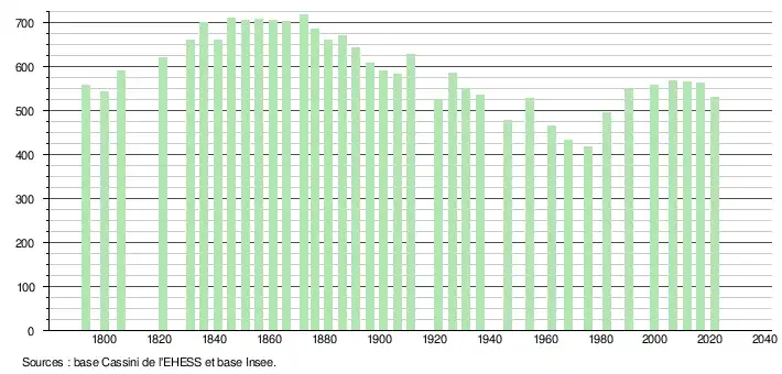 L'évolution du nombre d'habitants est connue à travers les recensements de la population effectués dans la commune depuis 1793. Pour les communes de moins de 10 000 habitants, une enquête de recensement portant sur toute la population est réalisée tous les cinq ans, les populations légales des années intermédiaires étant quant à elles estimées par interpolation ou extrapolation[17]. Pour la commune, le premier recensement exhaustif entrant dans le cadre du nouveau dispositif a été réalisé en 2006[18].
