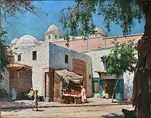 Jusqu’en 1909, Auguste et Cécile y participent au Salon Tunisien où leurs œuvres sont remarquées[11]. Cécile devient membre de la Société des peintres orientalistes français dès 1904 et exposera à ce Salon régulièrement jusqu’en 1914. La lecture des titres des tableaux est éloquente : toute référence aux thèmes floraux a disparu, le paysage règne en maître absolu, et presque exclusivement, il s’agit de paysages urbains, scènes de souks et de marchés, solidement structurés par l’architecture, tendus de forts contrastes lumineux. Les personnages, stéréotypés, intéressent peu le peintre : il est caractéristique qu’on retrouve, d’un tableau à l’autre, le même jeune garçon en chéchia et gilet sombre. Ces tableaux ont, de toute évidence, rencontré un assez grand succès auprès des amateurs. Quelques-uns ont été conservés par l’artiste afin de servir de modèles pour des copies partielles, dans des formats plus petits. C’est le cas de la Rue des Teinturiers présenté en 1907 au Salon tunisien, en 1908 au Salon des orientalistes et en 1926 au Salon colonial et de la Mosquée Halfaouine. Seuls changent les personnages chargés d’animer le décor.