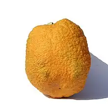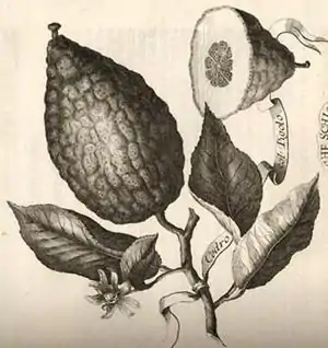 Cédrat de Chine - cédratier à fruits sillonnés, décrit par Volkamer «fruits de moyenne grosseur, allongés en cône, terminés par un mamelon pointu, marqués dans leur longueur de profonds sillons et relevés de côtes verruqueuses».