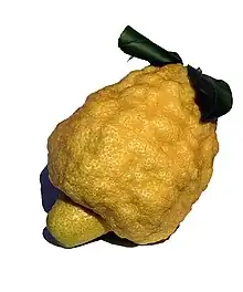 - cédratier à gros fruit ou cédratier de Gènes. Ce cédrat est celui mentionné dans la monographie de par Vincenzo Riccobono sur les agrumes cultivées au Jardin Botanique de Palerme (1899) aussi nommé cedro Gigante ou cédrat à gros fruit (a frutto grosso)[78]. Le nom de C. medica var. Maxima Risso lui est donné dans le bulletin de 1897 qui décrit le fruit ainsi «très gros fruit oblong, étroit et concave à la base, avec des sillons longitudinaux interrompus par des sillons transversaux, terminés par des mamelons plus ou moins hauts et sinueux, diam. 9 à 11 cm, longueur de 15 à 20 cm, peau avec gros tubercules, mésocarpe jaune sulfureux, spongieux, grand, pulpe amère»[79]. Curieusement J. B. Carpenter, le nomme var. dulcis[80].