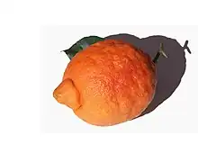 - Cédrat aurantiata. Gallesio décrit (NoVI) un C. x medica cedra aurantiata à fruit doux[88]. Probablement en rapport avec le cedro della Cina (cédrat de Chine) italien (qui pourrait aussi être le cédratier à fruits rugueux) qui est décrit comme spécialement rustique (−8 à −10 °C)[89] et qui appartenait à la collection des Medicis: C. medica aurantiata ou encore cedro aranciato pomo d’Adamo[90]. Le fruit de taille moyenne, avec une pulpe juteuse abondante[91], est très décoratif avec une peau finement et profondément granuleuse. Comme chez celui de Gallesio l'albedo a une saveur douce (le flavedo - zeste - est amer). On en fait des confitures, des fruits confits ou on le mange cru, frais et en salade[92]. Sa chromatogramme a été publié (γ-terpinene 12 %, limonéne 11 %, mircène 8 %)[93].