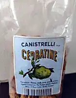 La cédratine désignait anciennement un détachant (cédratine à détacher)[35]. Inventée vers 1885, la première publicité pour la Cédratine - marque déposée de liqueur - Mattei à Bastia (inventeur de l'Amaro) apparait en 1896[36]: «Liqueur apéritive digestive et anti-épidémique, souveraine contre les fièvres et les épidémies»[36]. On fait des canistrelli aromatisés à la cédratine.