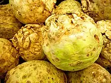 Nom commun : céleri-rave, céleri-navet, céleri pansu. de : Knollensellerie, Wurzelsellerie, en : celeriac, celery-root, es : apirrábano, apio nabo.