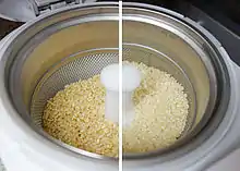 Le polissage ou blanchiment est une abrasion intense qui dénude totalement le grain de son enveloppe (péricarpe et testa) et aussi tout ou partie de la couche à aleurone et du germe, on parle de polissage pour le riz (polisseuse à riz), l'orge ou le blé dur[37]. Un ultime degré d'abrasion est le glaçage[38].