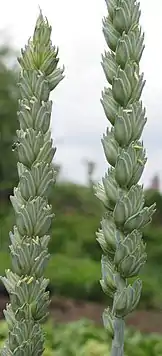 Les blés sauvages : amidonnier (Triticum turgidum), l'épeautre (Triticum spelta), les engrains (Triticum monococcum), le fonio blanc (Digitaria exilis) et le fonio noir (Digitaria iburua), l'orge (Hordeum), les riz (Oryza), le millet commun (Panicum miliaceum) sont des céréales vêtues cultivées. Le pain est caractéristique des traditions culturelles néolithiques du Proche-Orient, rare région du monde où la domestication des céréales a eu lieu sans récipients de cuisson en poterie (contrairement au développement précoce de la céramique au Sahara ou en Asie Orientale) incite y chercher l'origine de farines panifiables [20]. Le blé panifiable (Triticum aestivum), céréale à grain nu, est apparu au IXe millénaire av. J.-C. dans cette région. Sans cesse amélioré par l'homme depuis lors il n'est pas une espèce sauvage mais une hybridation entre l'amidonnier cultivé et Aegilops tauschii [21],[22]. L'histoire des blés est une suite de mutations successives : au rachis cassant des blés sauvages (Triticum boeoticum et Triticum dicoccoides) succède le rachis non cassant des blés décortiqués domestiqués, leur caractère de battage libre donne naissance à des blés (Triticum durum et Triticum spelta) avec des grains nus à haut rendement battus librement qui à leur tour voient une sélection de nombreux cultivars[23].