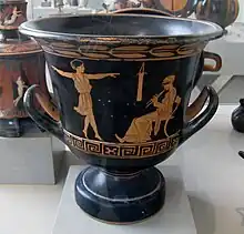 Les thèmes les plus fréquents empruntés à la mythologie sont les banquets des Dieux, la guerre des Amazones[7], Bellérophon et Héraclès[8], ainsi que des scènes tirées du cycle des Troyens. On trouve en outre des épisodes de légendes peu représentées dans le reste de l'art antique. Plusieurs scènes, aux motifs dionysiaques ou érotiques, s'inscrivent dans le cadre de la culture funéraire et du culte des morts des peuples méditerranéens anciens. C'est surtout grâce à la peinture sur vases que l'on peut se faire une idée des représentations antiques de l'Au-delà. Les visages féminins semblant fleurir d'un bouton ou s'insérant entre deux rangées relèvent de la même symbolique. Parfois ces visages féminins sont remplacés par ceux de Pan, d’Hermès ou d’Orientaux. Vers la seconde moitié du IVe siècle, les scènes de mariages, les portraits de femmes ou les scènes érotiques deviennent à la mode. On peut même voir des scènes théâtrales (aussi bien des tragédies que des farces, ou phlyaques) sur les vases d'Apulie et d'autres vases de Grande-Grèce, alors que l'on n'en voit jamais sur les vases attiques ; et parallèlement, après 370 av. J.-Chr. , les scènes de la vie quotidienne et athlètes disparaissent presque entièrement du répertoire pictural.