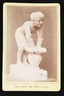 Il y a peu d'information sur la méthode et le lieu de l'extraction de la matière première par les potiers d'ancienne Égypte, comme les droits de propriété sur les mines, l'organisation du transport et la distribution aux potiers[8]. On peut dire en général que l'argile pouvait provenir de trois régions différentes : du rivage du Nil ou d'un canal d'irrigation, de la plaine désertique près des zones cultivées ou des collines du désert à plus haute altitude. Une représentation dans le tombeau de Rekhmirê (TT100) montre des travailleurs qui exploitent un tas de boue du Nil avec des pioches pour la fabrication de tuiles d'argile. L'argile pour la fabrication de céramique pourrait avoir été exploitée de la même manière. La scène montre aussi que l'argile du Nil n'avait pas à être forcément exploitée dans un champ. Des tas d'argile du Nil étaient amassés, comme encore maintenant, pendant le creusement d'un canal[9].