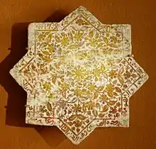 Au dessus de la niche du mihrab, de la mosquée de Sidi Okba à Kairouan, le mur du fond est décoré de faïences lustrées de forme losangée. Ces carreaux ornés de feuillages et de fleurs stylisées seraient, selon la tradition, une commande du fondateur de la dynastie des Aghlabides, Ibrahim ibn al-Aghlab (836-841) à des artisans mésopotamiens d'Irak. Il se trouve donc confirmé qu'à cette époque, la Perse aurait connu le procédé de la céramique lustrée[4]. Ce motif de carré sur la pointe perdura jusqu’à la fin du XIIIe siècle au moins. On le retrouve dans un tympan de la Grande Mosquée de Sousse situé à l’emplacement du premier mihrab ; il émigre ensuite en Égypte, où il orne différents monuments fatimides et mamelouks du Caire[5].