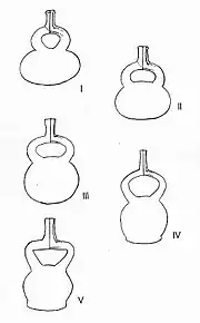 - Parmi les céramiques sculptées en ronde-bosse, des vases-bouteilles à corps ovoïde sont décorés ou sculptés et surmontés de l’anse-étrier caractéristique.