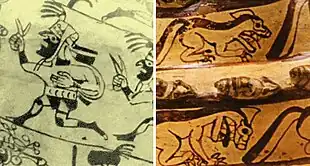 On constate une différence de traitement entre les pièces ornées de scènes de la vie quotidienne, inventives et parfois cocasses et le caractère figé des représentations religieuses - telles les images de la divinité Ai apaec - ou rituelles. Parmi celles-ci, les scènes de guerre, de pêche ou de chasse confirment la dimension religieuse de ces événements[1].