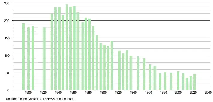 L'évolution du nombre d'habitants est connue à travers les recensements de la population effectués dans la commune depuis 1793. Pour les communes de moins de 10 000 habitants, une enquête de recensement portant sur toute la population est réalisée tous les cinq ans, les populations légales des années intermédiaires étant quant à elles estimées par interpolation ou extrapolation[23]. Pour la commune, le premier recensement exhaustif entrant dans le cadre du nouveau dispositif a été réalisé en 2006[24].
