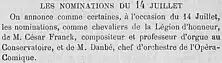 À l'occasion des festivités du 14 juillet 1885 sont annoncées les nominations de César Franck et de Jules Danbé, chef d'orchestre de l'Opéra-comique, au grade de chevalier de la Légion d'honneur. La nouvelle est confirmée par décret du 6 août[20]. Cette même année 1885 voit la composition des Variations symphoniques pour piano et orchestre, pièce créé le 1er mai 1886 à Paris : Franck lui-même est à la direction d'orchestre et la partie de piano est jouée par Louis Diemer. La pièce, dont les deux thèmes ne sont pas exposés dès le début, comme dans les variations composées par Mozart, Beethoven, Brahms ou Liszt, mais construits petit à petit par les variations, est ovationnée à sa première. Maurice Emmanuel en dira : « Dans la littérature pianistique, ces pages sont un monument neuf. [...] Cela ne saurait se décrire mais il faut l'évoquer. Franck a écrit cet ouvrage à soixante-trois ans[21]. »
