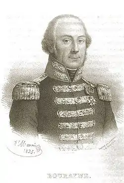 Mais ce que le commandant Bourayne n'a pu dire, et que nous tenons d'un des officiers de son état-major (Mr de la Rouvraye, aujourd'hui capitaine de frégate), c'est le sang-froid dont lui-même a fait preuve dans cette action ; nous nous contenterons d'en citer deux traits. Pendant le combat, un boulet vint frapper l'une des cornes de son chapeau et le faire tourner sur sa tête : « Apparemment, dit-il, ces b…–là ne me trouvent pas bien brassé. » Et il rétablit son chapeau dans la position qu'on appelle carrée. Dans un autre moment, Bourayne était près d'une caronade, sa longue vue à la main, observant ce qui se passait à bord du vaisseau anglais ; la caronade, frappée par un boulet, vole en éclats, blesse plusieurs hommes et le renverse lui-même sur le pont. On le crut tué ; on court à lui ; mais, se relevant aussitôt, et montrant sa longue-vue qu'il n'avait point quittée : « Elle n'est pas cassée », dit-il. Voir aussi[9]