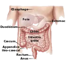 Le côlon (du latin colon, du grec ancien κῶλον / kōlon)[1], est situé, dans l'abdomen, entre la valvule iléo-cæcale et la jonction recto-sigmoïdienne[2] chez les mammifères. Il commence dans le fosse iliaque droite et fait suite à l'intestin grêle. Il débouche dans le rectum, avec lequel il forme le gros intestin. Il se dispose en cadre dans la cavité abdominale. Chez l'humain, il mesure environ 1,5 m de long pour 4 cm de diamètre, soit un volume d'environ 1,8 litre.