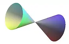 - comme surface, il s'agit de la surface engendrée par la révolution d'une droite sécante à un axe fixe autour de ce dernier. Il s'agit d'un cas particulier de cône. Les coniques forment une famille très utilisée de courbes planes algébriques résultant de l'intersection d'un plan avec un cône de révolution.