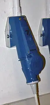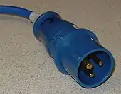 La prise bleue 3P+N+T, 9h (270°) est un connecteur monophasé utilisable dans les régions utilisant à la fois le 110 V et le 240 V, utilisé en remplacement sécurisé des connecteurs NEMA pour l'éclairage la production sonore de puissance en extérieur par les professionnels du domaine. Aux États-Unis, il est utilisé en simple phase, en utilisant soit le 110–120 V entre phase et neutre soit le 220–240 volts entre deux phases ; comme ce mode n'a pas besoin de trois phases, il existe un connecteur jaune non standard conçu pour cet usage particulier.