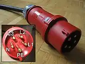 Les cinq broches sont positionnées en cercle (les phases sont dans l'ordre P1/P2/P3) avec le connecteur de terre plus gros et long. Pour certains moteurs dont le sens de rotation dépend de l'ordre de connexion aux phases, un adaptateur est utilisé pour inverser leur câblage.