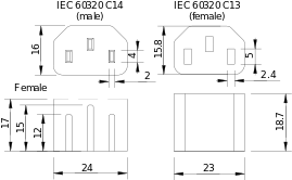 C14 (destination[5]/mâle[6]) - exemple de prise mobile[8] (selon la norme, c'est une prise pour coupleur d'interconnexion de type E).