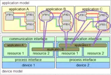 CEI 61499 permet une conception orientée sur l’application, dans laquelle une ou plusieurs applications, définies par des réseaux de blocs fonction interconnectés, sont créées pour l'ensemble du système et ensuite distribuées aux équipements disponibles. Tous les périphériques d'un système sont décrits dans un modèle de périphérique. La topologie du système est reflétée par le modèle du système. La distribution d'une application est décrite dans le modèle de cartographie. Par conséquent, les applications d'un système sont distribuables mais maintenues ensemble.