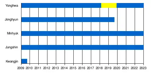- Jung Shin/Lee Jung Shin (coréen : 이정신) (japonais : イ・ジョンシン, chinois : 李正信), né le - basse, rap, chœurs. Il a joué en mars 2011 dans le clip Heart to Heart des 4Minute. C'est lui le remplaçant de Kwon Kwang Jin, qui a quitté le groupe peu avant leurs débuts en Corée du Sud. Il a joué le rôle de Kang Seo-Woo dans le drame Cinderella and the four knights.