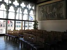 En 1956, le président Agostino Lanzillo a demandé à Carlo Scarpa de transformer l’amphithéâtre en salle de cours. L’architecte a donc enlevé l’amphithéâtre et réalisé la boiserie, en utilisant une partie du même bois employé pour l’amphithéâtre. La boiserie fonctionne comme une connexion et aussi comme une séparation entre la salle et le couloir ; les panneaux de la boiserie sont utilisés pour cacher la salle et quand ils sont fermés ils rappellent l’ogive de la fenêtre gothique. L’image de la fenêtre gothique est réfléchie sur le verre de la boiserie en produisant un effet particulier de la lumière.