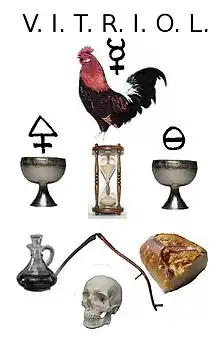 Les murs peuvent arborer la formule alchimique et maçonnique : V.I.T.R.I.O.L (dans les rites de souche écossaise) ou V.I.T.R.I.O.L.U.M. signifiant : « Visita Interiora Terrae Rectificandoque Invenies Occultum Lapidem (Veram Medicinam) », soit traduit littéralement « Visite l'intérieur de la terre et en rectifiant tu trouveras la pierre cachée (médecine de vérité) ». L'ethnologue et historien français Jean Servier traduit la locution latine par : « Descends dans les entrailles de la terre, en distillant tu trouveras la pierre de l’œuvre ». Il s'agit pour le candidat maçon de lire ou d'épeler cette formule invitant à l’introspection[7]. L'acronyme pouvant en effet être considéré comme l'équivalent du « Connais-toi toi-même et tu connaîtras l'univers et les dieux » qui figurait au fronton du temple d'Apollon à Delphes, qui fut repris par Socrate et utilisée par Platon dans le Charmide[8]. L'acronyme est entouré de symboles évocateurs de la condition humaine comme un crâne ou du pain moisi, d'autres qui se réfèrent à la morale alchimique comme le sel, le soufre ou un coq représentant le mercure ou la persévérance. Diverses sentences peuvent figurer sur les murs, comme : « Si la curiosité t'a conduit ici, va-t'en. - Si ton âme ressent l'effroi, ne va pas plus loin ! ».