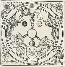 Sur la petite table ou le néophyte écrit son testament philosophique, se trouvent trois récipients contenant les trois éléments de base de toute transmutation : soufre, sel et mercure[17]. Le mercure était pour les orfèvres un produit noble qui permettait de purifier l’or et l’argent en les débarrassant de toutes les « impuretés » métalliques. En alchimie, le sel, le soufre et le mercure désignent les trois principes fondateurs de toutes choses[21].