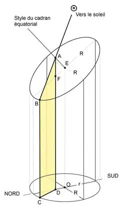 Dans la vue détaillée, il n'est plus midi solaire mais une heure quelconque. Le Soleil n'est plus situé dans le plan méridien, il est dans la direction AB. L’ombre observée en B sur le cadran équatorial est créée par le point A du style du cadran équatorial. L'angle ABE est la déclinaison du Soleil pour la date d'observation. Le point A ne dépend donc pas de l’heure mais uniquement de la déclinaison du Soleil et de la date, il en est de même pour sa projection D sur le plan horizontal.