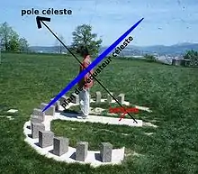 Le cercle équatorial est figuré en bleu sur la figure. C'est un cercle de rayon R qui est "basculé" sur le plan équatorial (c'est-à-dire vers le pôle céleste) d'un angle égal à la différence entre 90 ° et la latitude, soit pour Saint-Étienne d'environ 45°, exactement 90° - 45°27'. (Le pôle céleste est ce que l'on peut observer la nuit comme centre apparent des étoiles en mouvement.)
