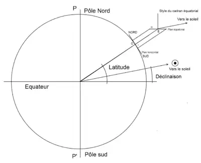 - une tige (un style) parallèlement à l'axe des pôles P-P', passant par le centre du cercle horaire.