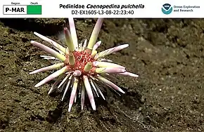 - Caenopedina pulchella (A. Agassiz & H.L. Clark, 1907) (Pacifique, Hawaii[3] et Nouvelle-Zélande)