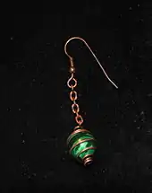 Boucles d'oreille avec une cage à perle en cuivre contenant une malachite.