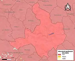 La commune est vulnérable au risque de mouvements de terrains constitué principalement du retrait-gonflement des sols argileux[25]. Cet aléa est susceptible d'engendrer des dommages importants aux bâtiments en cas d’alternance de périodes de sécheresse et de pluie. 99,8 % de la superficie communale est en aléa moyen ou fort (76,3 % au niveau départemental et 48,5 % au niveau national). Sur les 641 bâtiments dénombrés sur la commune en 2019, 641 sont en aléa moyen ou fort, soit 100 %, à comparer aux 90 % au niveau départemental et 54 % au niveau national. Une cartographie de l'exposition du territoire national au retrait gonflement des sols argileux est disponible sur le site du BRGM[26],[Carte 2].
