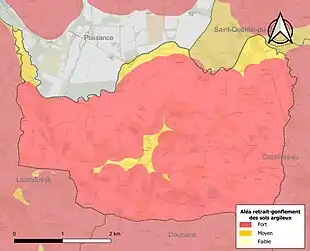 Le retrait-gonflement des sols argileux est susceptible d'engendrer des dommages importants aux bâtiments en cas d’alternance de périodes de sécheresse et de pluie[20]. 99,8 % de la superficie communale est en aléa moyen ou fort (91,8 % au niveau départemental et 48,5 % au niveau national)[Carte 2]. Depuis le , en application de la loi ELAN, différentes contraintes s'imposent aux vendeurs, maîtres d'ouvrages ou constructeurs de biens situés dans une zone classée en aléa moyen ou fort[Note 2],[21].