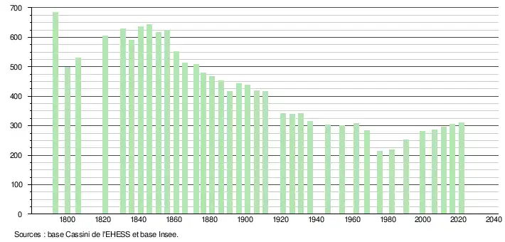 L'année démographique où il y a eu le maximum d'habitants était en 1793 avec 685 habitants et l'année démographique où il y a eu le minimum d'habitants était en 1975 avec 214 habitants.